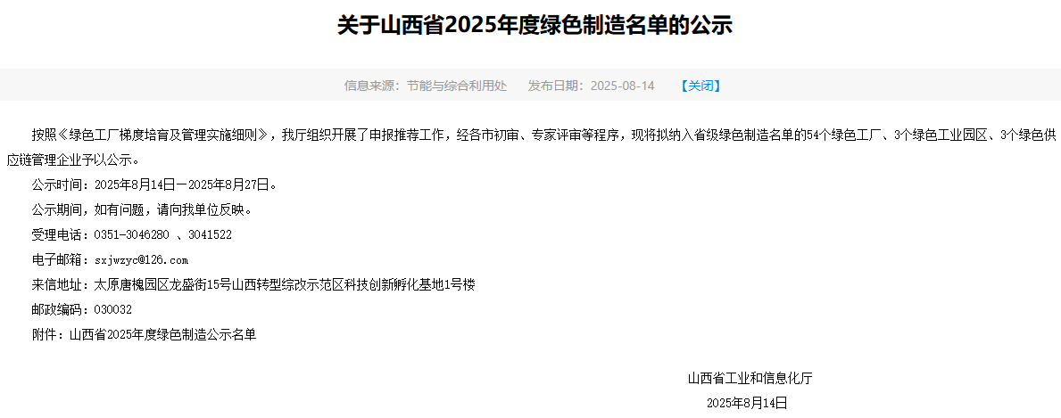2025年8月14日,山西省工业和信息化厅就山西省2025年度绿色制造名单对外进行公示,公示时间:2025年8月14日-2025年8月27日。